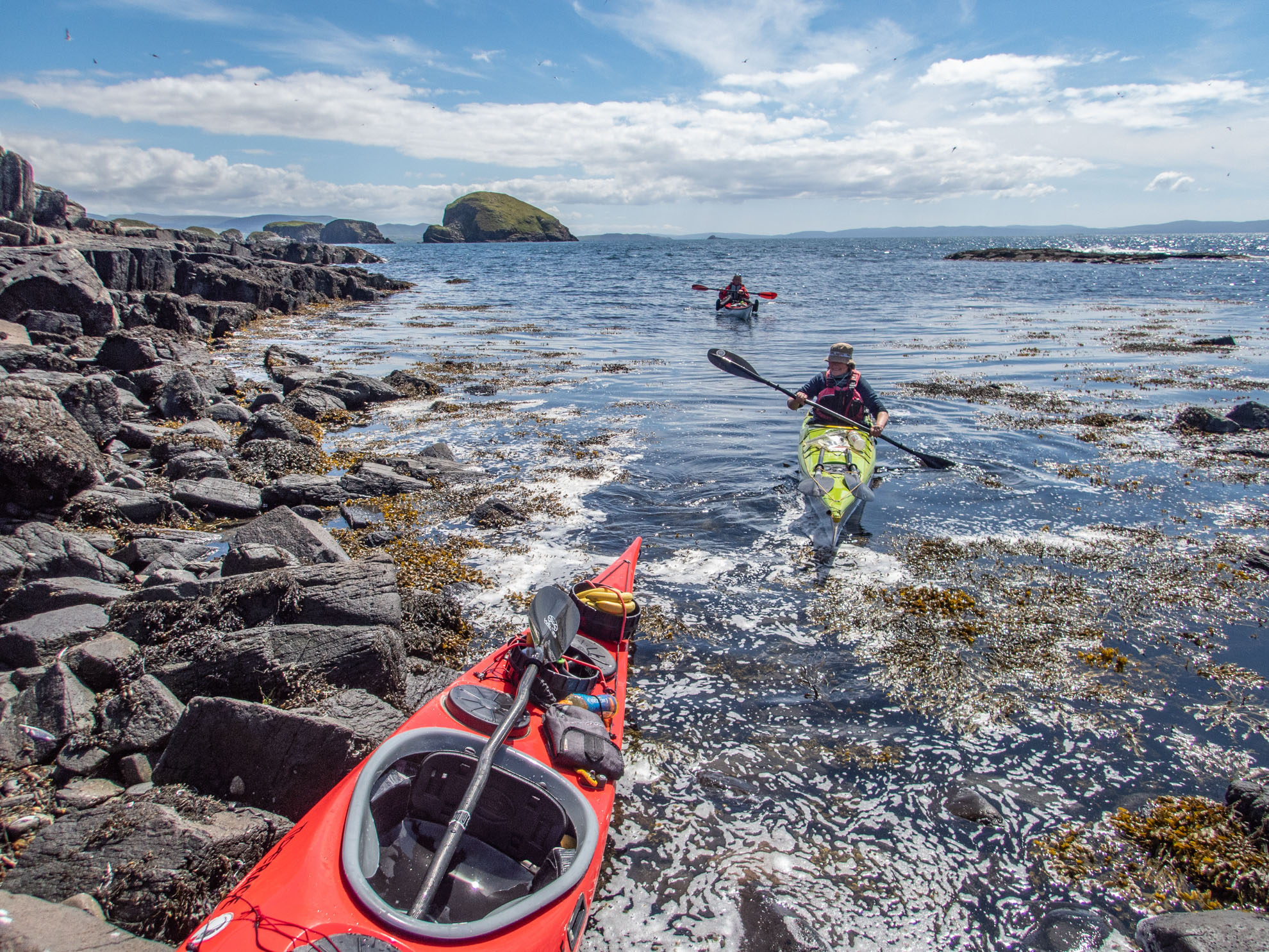 Eilean an Taighe from Garbh Eilean with the kayaks visible on the shore by the narrow shingle beach which divides the two islands.