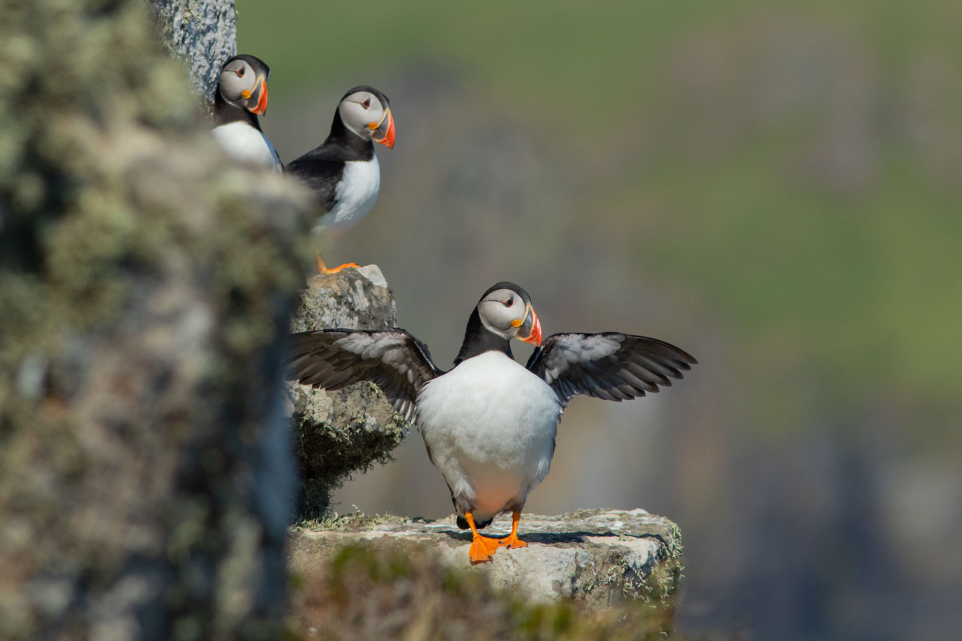Puffin on the cliffs on the East side of Garbh Eilean stretching their wings
